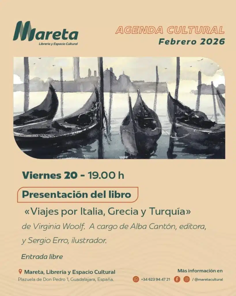 Este viernes, 20 de febrero, a partir de las 19.00 horas, el espacio cultural Mareta de Guadalajara va a acoger la presentación de ‘Viajes por Italia, Grecia y Turquía’, de Virginia Woolf. Durante el evento, intervendrán Alba Cantón, editora, y Sergio Erro, ilustrador.