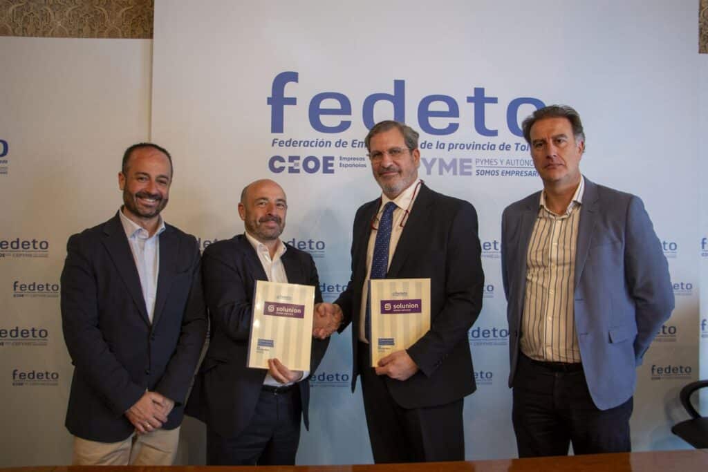 La compañía de seguros de crédito y de caución y de servicios asociados a la gestión del riesgo comercial Solunion y la Federación de Empresarios de la provincia de Toledo (Fedeto), han firmado un acuerdo de colaboración con el objetivo de ofrecer a las empresas y empresarios asociados condiciones ventajosas en el asesoramiento técnico y los productos de seguros de crédito de Solunion.