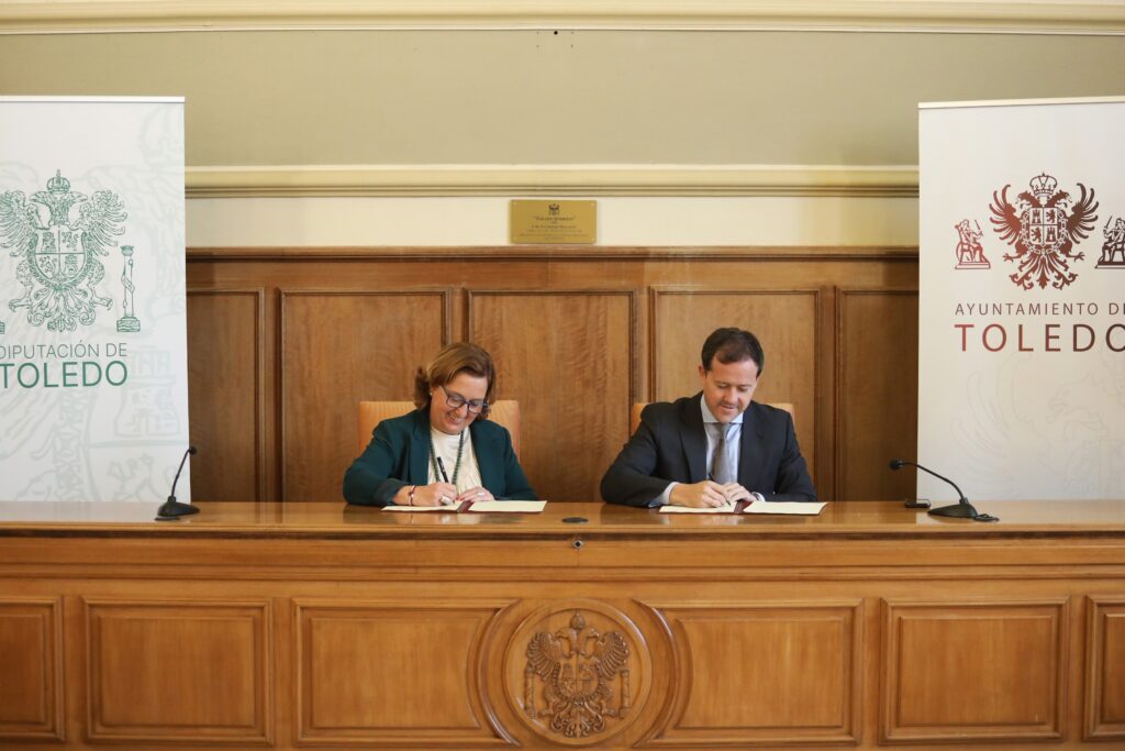 La presidenta de la Diputación, Concepción Cedillo, firma el convenio con el alcalde de Toledo, Carlos Velázquez, para ejecutar ‘Toledo emerge’.