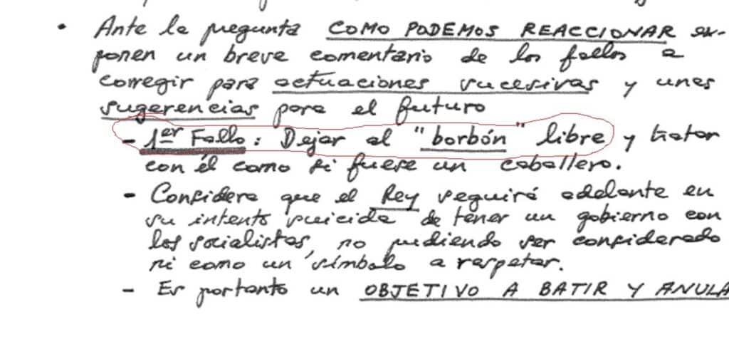 El objetivo, precisa el documento, es que «por encima de todo se pretende que la Corona no salga lesionada del proceso y que en todo caso, los intentos en tal sentido no provengan de los principales procesados y de reconocida vocación monárquica».