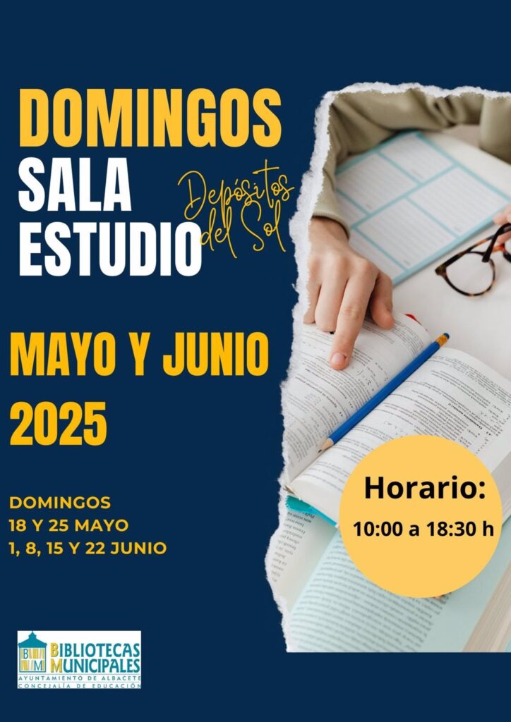 Cartel de la apertura los domingos de la sala de estudio de los Depósitos del Sol. Publicado 14 May 2025 11:12 La sala de estudio de los Depósitos del Sol, en Albacete, va a abrir sus puertas los próximos domingos 18 y 25 de mayo, así como los días 1, 8, 15 y 22 de […]