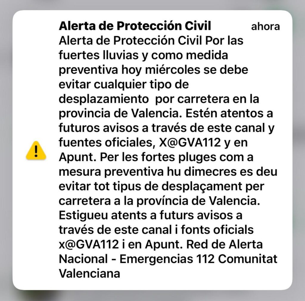 Emergencias lanza una alerta móvil de protección civil por lluvias y pide evitar desplazamientos en Valencia Publicado 30 Oct 2024 07:38 VALÈNCIA, 30 El Centro de Coordinación de Emergencias (CEE) de la Generalitat Valenciana ha lanzado en la mañana de este miércoles una nueva alerta móvil de protección civil Es-Alert a causa de las fuertes […]