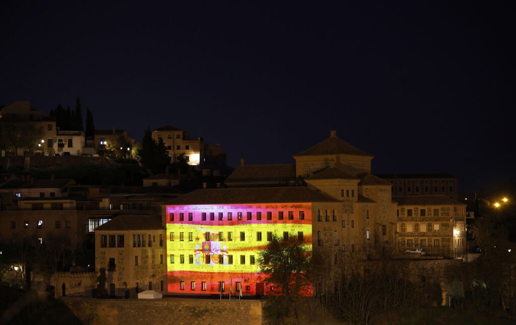 Una imagen en movimiento de la bandera de España ilumina la fachada de las Cortes de C-LM por el Día de la Constitución