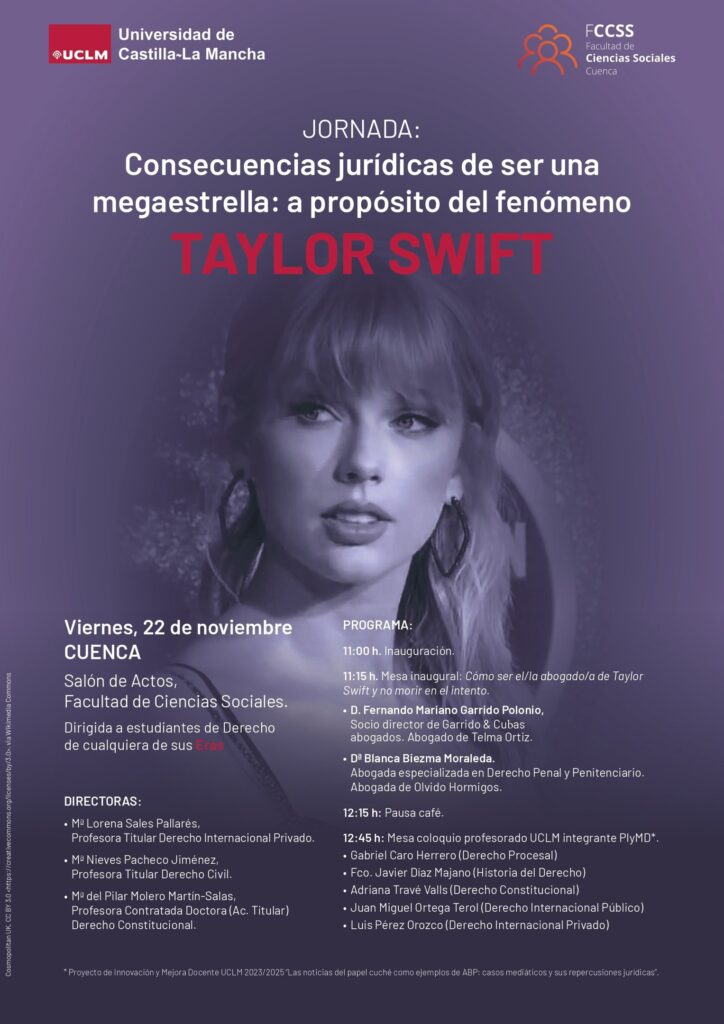 Cartel de la jornada ‘Consecuencias jurídicas de ser una megaestrella: a propósito del fenómeno Taylor Swift’. Publicado 18 Nov 2024 12:49 CUENCA, 18 La Facultad de Ciencias Sociales de la Universidad de Castilla-La Mancha (UCLM) en el Campus de Cuenca acogerá el próximo viernes, 22 de noviembre, la jornada ‘Consecuencias jurídicas de ser una megaestrella: […]