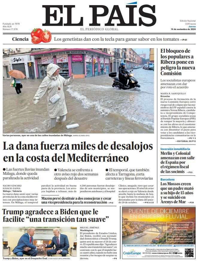 PORTADAS Publicado 14 Nov 2024 01:09 MADRID, 14 Las primeras ediciones de los principales periódicos llegados a nuestra redacción incluyen, entre otras, las siguientes noticias en sus portadas: EL PAÍS: «La dana fuerza miles de desalojos en la costa del Mediterráneo»; «Trump agradece a Biden que le facilite «una transición tan suave»»; «El bloqueo de […]
