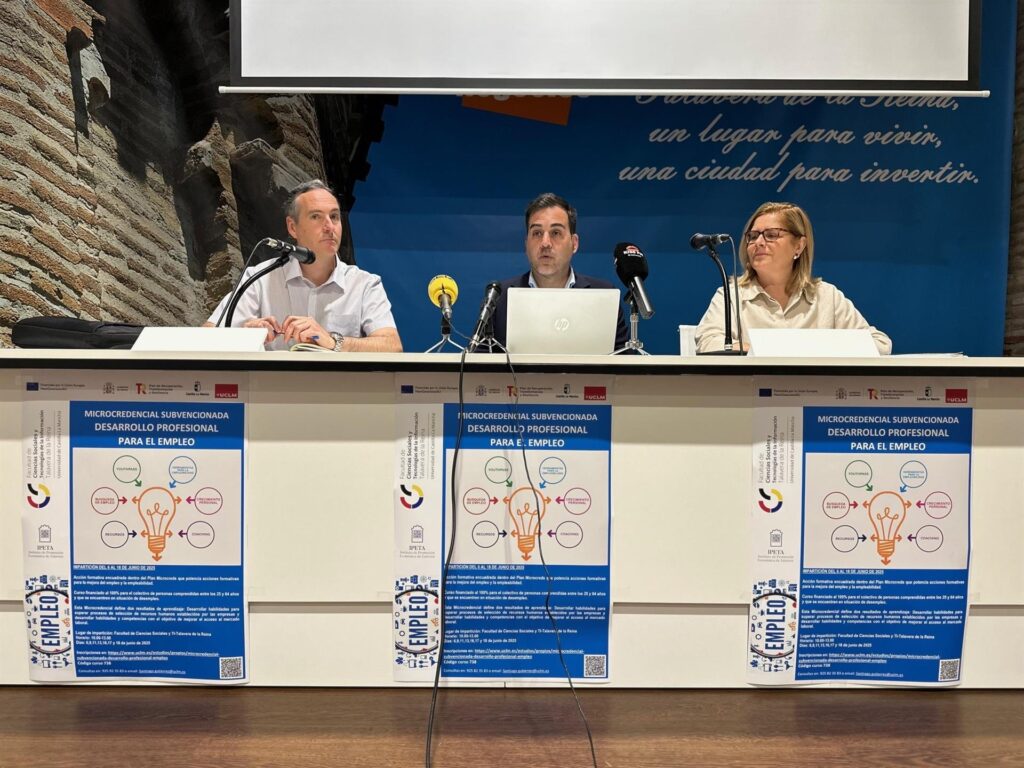 . Publicado 23 May 2025 15:03 El concejal de Empleo del Ayuntamiento de Talavera, Javier Muñoz-Gallego, junto al vicerrector de Posgrado y Formación Permanente de la UCLM, Santiago Gutiérrez, y la coordinadora de Ipeta, Montse Jiménez, han presentado la Microcredencial subvencionada ‘Desarrollo profesional para el empleo’ que se desarrollará en la Facultad de Ciencias Sociales […]