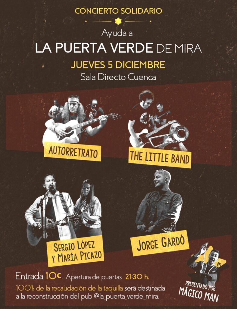 Cartel del concierto que se celebrará en la Sala Directo Cuenca para recaudar fondos para reconstruir el pub de Mira. Publicado 19 Nov 2024 13:53 CUENCA, 19 La Sala Directo Cuenca acogerá el jueves 5 de diciembre un concierto solidario para recaudar fondos para la reconstrucción de La Puerta Verde, pub de Mira destrozado por […]