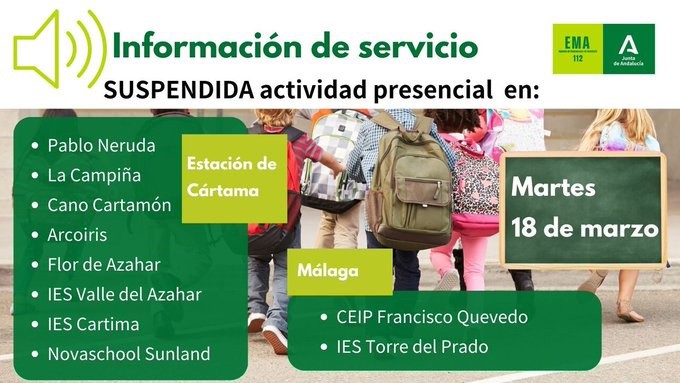 Centros educativos de Málaga con la actividad presencial suspendida por las incidencias provocadas por el temporal de lluvias Publicado 18 Mar 2025 08:15 MÁLAGA, 18 La actividad educativa presencial ha sido suspendida este martes 18 de marzo en ocho centros educativos de Estación de Cártama, en la provincia de Málaga, y dos en la capital […]
